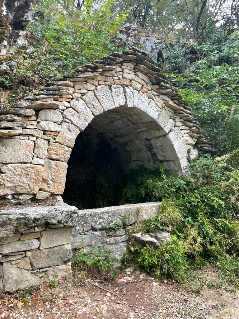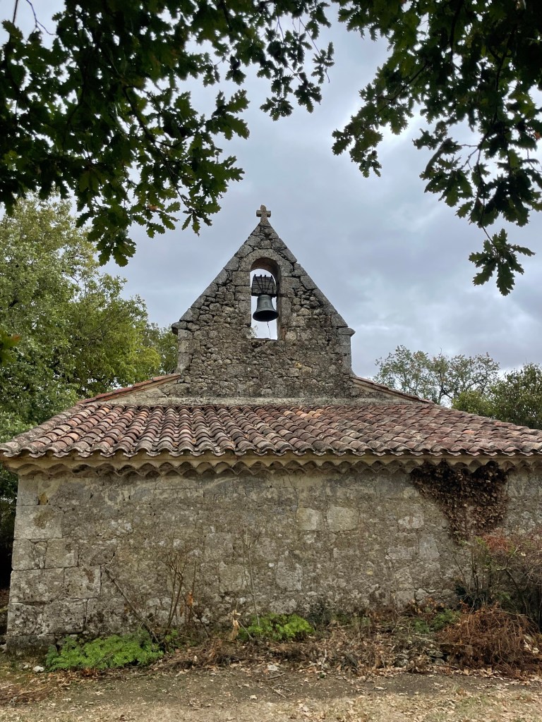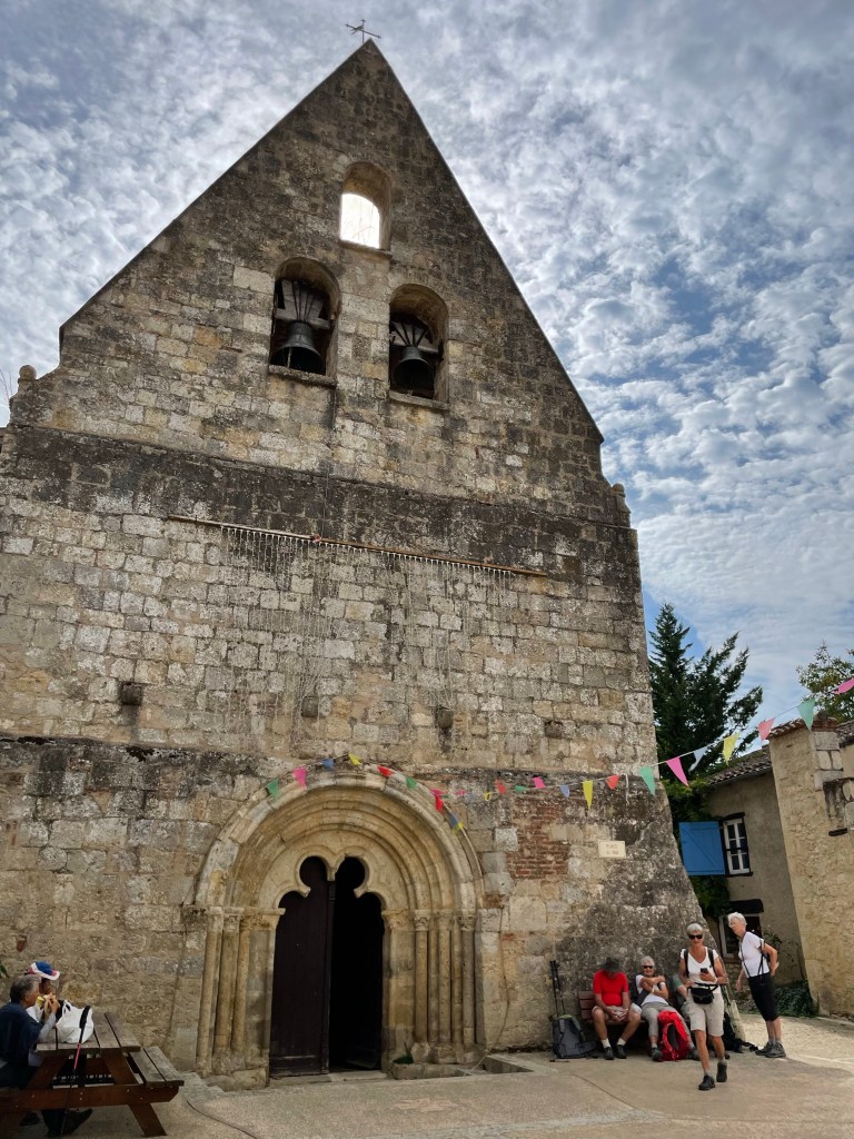 After passing Pech Merle it was primarily a lovely walk along a dirt road and paths, sometimes in the open, and sometimes through lovely woods. There was another long descent, but it was not as steep a grade as usual. The really tough part was the section before you get to the village of Bouzies where you have to walk along the road. Honestly, that was the scariest, most dangerous part of this walk so far. There are vehicles of all sizes speeding by, even though the sign says “watch out for walkers!!” And no shoulder to walk on. Sometimes there is a tiny bit of space between you and traffic, but most of the time there is a cliff on one side and a low wall between you and the drop into the river on the other. I hugged the cliff for much of the time. Finally you get to turn off the road, cross the river (on a one-lane bridge!), and then stumble into the church just past the river to give thanks that you survived the road-walking.