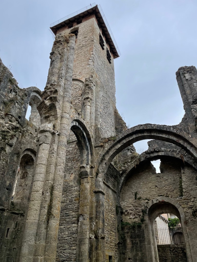 After a nice cafe crème with two new friends from Colorado, it was back into the countryside until the next village of Flamarens. The church in this village is actually a ruin. They managed to keep what is left from collapsing—it looks like maybe they did that by putting a roof on it, and from what I could tell from the signs it looks like they have plans to restore/rebuild it. It has a long way to go. As you will see, almost one entire side is gone. Right next to it is a chateau that apparently was neglected for four decades in the 20th century and in very bad shape after a fire, but it has been restored. It may even be run as a gite now—I’m not sure.