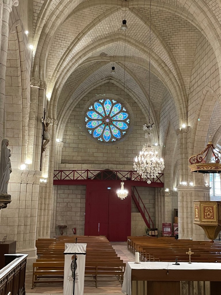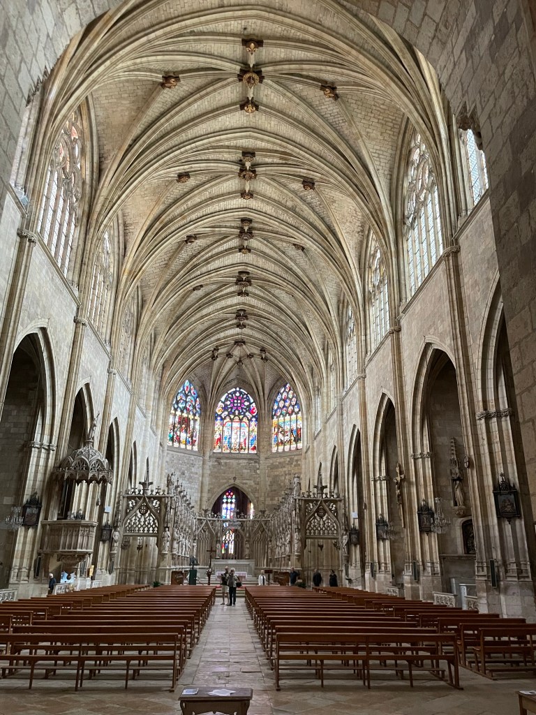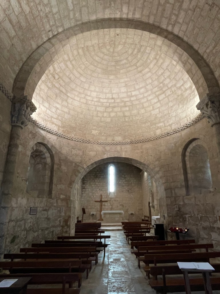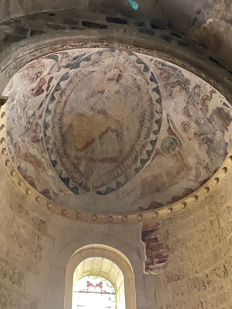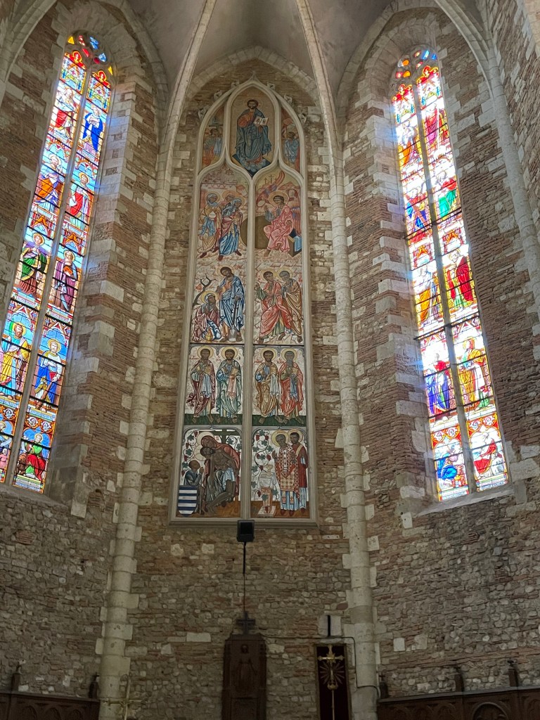 Here are some photos from the church in Nogaro, Collegiale St. Nicholas, where we had a couple of hours before catching the bus. It dates back to the 11th century. It’s beautiful and has a very important old fresco that is one of the earliest to depict pilgrims, and tells the story of the martyrdom of St. Laurent. And you’ll have to google that story, because I haven’t! Looking at how immense this church is, it just amazes me that they had architects and builders that could do this a thousand years ago without any modern technology.