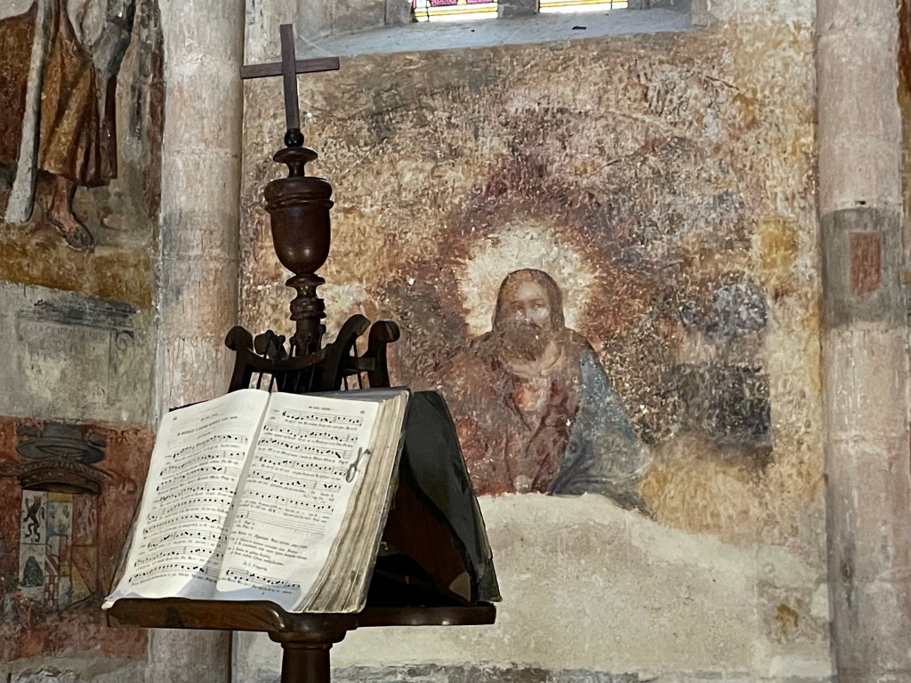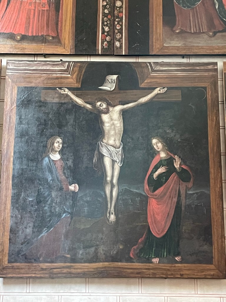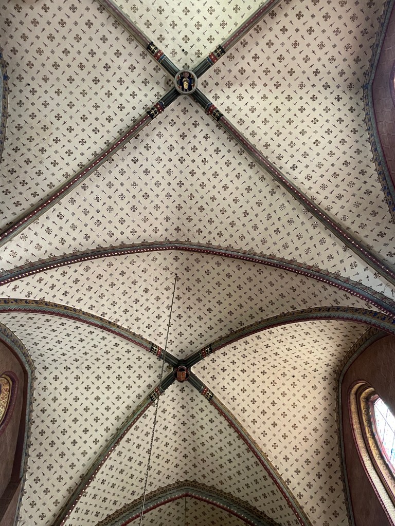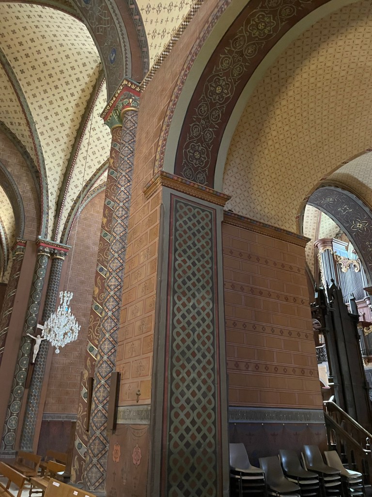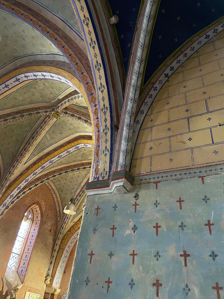 Here are some photos from the church in Nogaro, Collegiale St. Nicholas, where we had a couple of hours before catching the bus. It dates back to the 11th century. It’s beautiful and has a very important old fresco that is one of the earliest to depict pilgrims, and tells the story of the martyrdom of St. Laurent. And you’ll have to google that story, because I haven’t! Looking at how immense this church is, it just amazes me that they had architects and builders that could do this a thousand years ago without any modern technology.