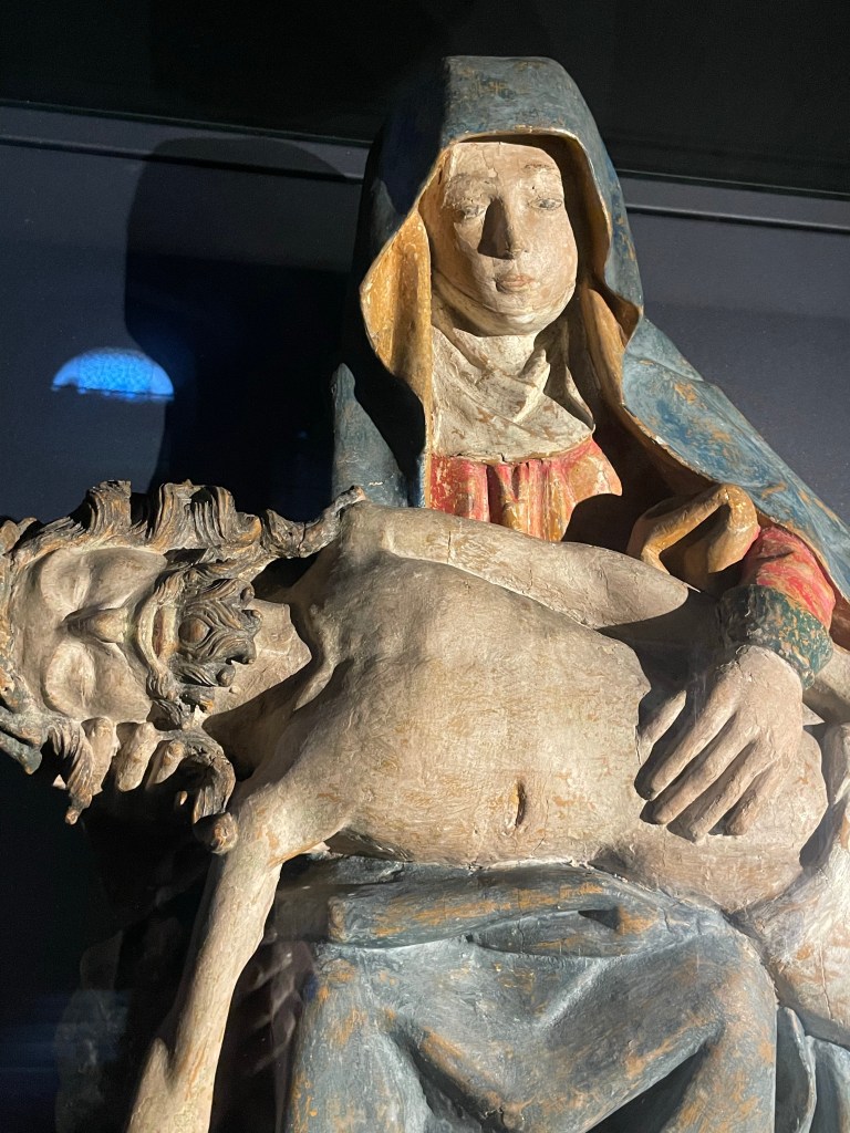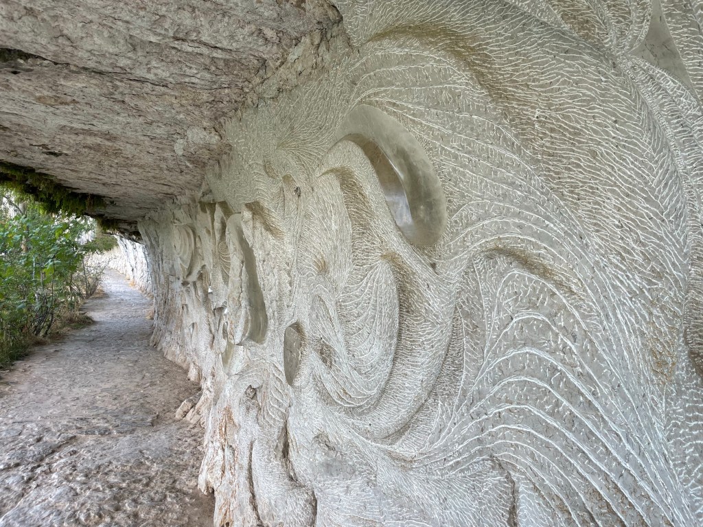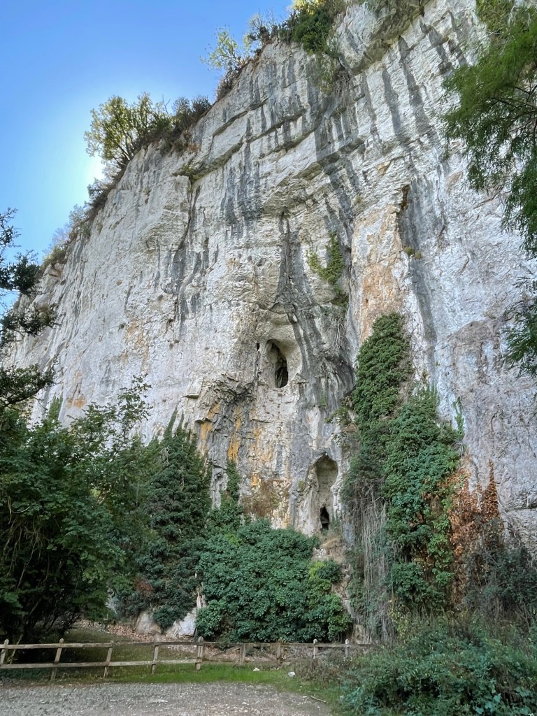 Here’s some of what I learned from the guide. The drawings were made with ochre and something that begins with “m” (the black color) that I can’t remember. It is not possible to date either of these substances. However, there is one part of the painting, a horse’s mane, that was done in charcoal, which can be dated, and that part is 30,000 years old. So they think the dates of all the paintings are a few thousand years either side of that. The frieze done in black, which is of several animals, they believe was done in one sitting by the same artist. They call him (her?) “The black frieze artist” and have recognized their work in other parts of the cave. There are mammoths, bison, horses, one head of a bear, some female figures and a couple drawings they call “the wounded man”. Oh—before I go further, you need to google “Pech Merle” so you can see the paintings, because I have no photos to show you. Photography is strictly forbidden in the caves, to protect the paintings from light. The fine for taking even one photo is 15,000 Euros, and the guide was VERY strict. She insisted people put their phones away because she had had a lot of trouble with a group earlier in the week. You would think people would comply with this, but she had to keep telling one woman repeatedly, “please, I do not want to even see your phone.”