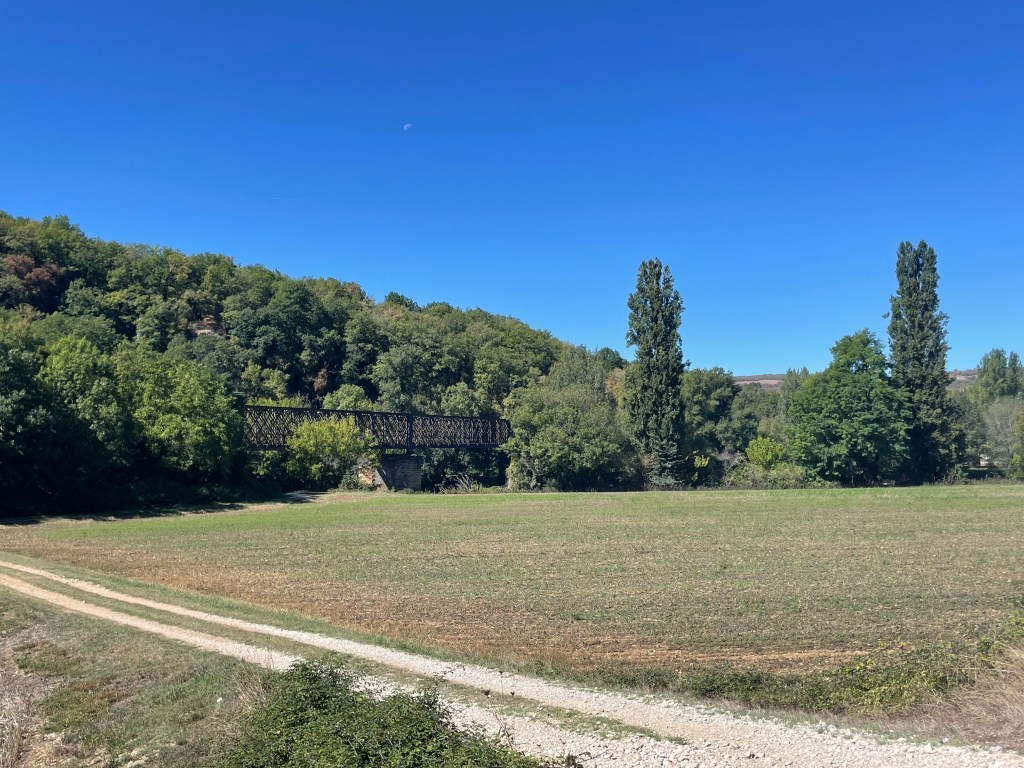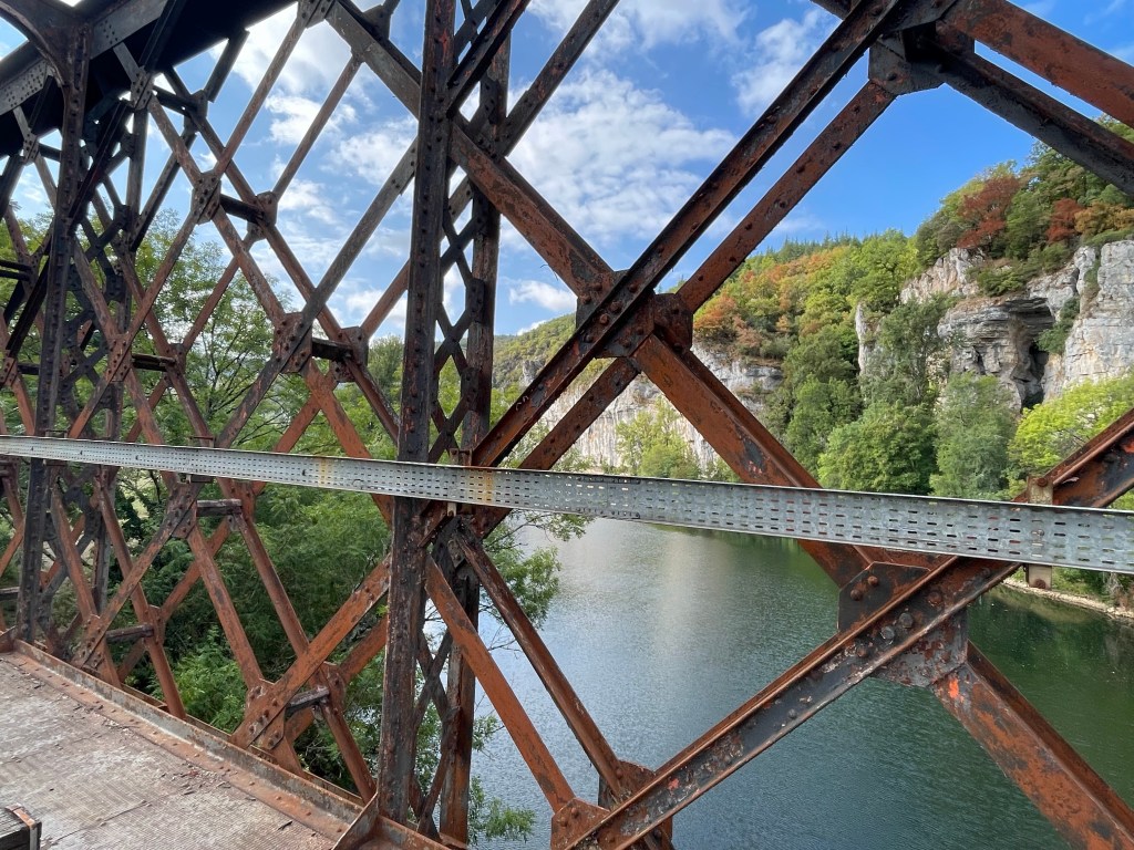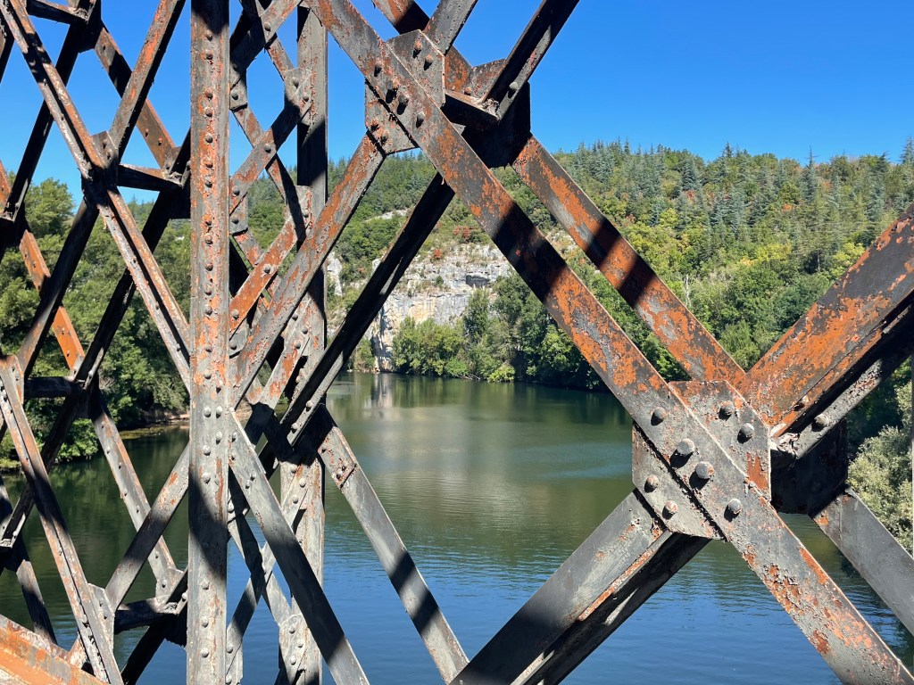 There is an alternative, which is not part of the official route. And should be. It is also a short cut. It involves scrambling up a steep embankment and crossing the river on a retired Eiffel railroad bridge, then scrambling down the steep embankment on the other side. Even without poles, those scrambles were not nearly as risky as walking on that road was. The guide book I’m depending on said that because of the scrambling up and down this short cut might not be for everyone, so I took that to mean me. But everyone I talked to at dinner last night, and on the FB group for this route said, “take the bridge!! You can absolutely do it. It is a fun experience and so much safer.” So that’s what I did this morning since I had to backtrack to Cabrerets. (Today I did yesterday’s walk in reverse.) And even with my fear of heights, it was a cool experience. Here are a couple of photos: