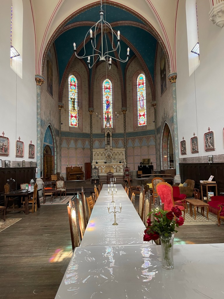 I’m staying in a very unique gite tonight, the Chapel of the Ursulines. Chapel of a former Ursuline convent build in the late 19th century, abandoned in the early 20th century, fell into great disrepair, was bought privately and restored. It is a wonderful environment. And there is a massage therapist giving twenty minute massages for a donation. Heaven.